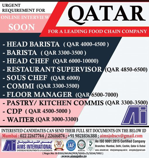 URGENT REQUIREMENT FOR ONLINE INTERVIEW QATAR SOON FOR A LEADING FOOD CHAIN COMPANY - HEAD BARISTA (QAR 4000-4500) - BARISTA (QAR 3300-3500 ) - HEAD CHEF (QAR 6000-10000) - RESTAURANT SUPERVISOR (QAR 4850-6500) - SOUS CHEF (QAR 6000) - COMMI (QAR 3300-3500) - FLOOR MANAGER (QAR 6500-7000) - PASTRY/ KITCHEN COMMIS (QAR 3300-3500) - CDP (QAR 4500-5000) - WAITER (QAR 3000-3300) INTERESTED CANDIDATES CAN SEND THEIR FULL SET DOCUMENTS ON THE BELOW ID Mumbai : 022 22617744 /22616874 ; +91 9821836388; aimsjobscv@gmail.com . An ISO 9001:2015 Certified Company AIMS INTERNATIONAL Branches: Mumbai, Delhi, Cochin, Qatar & Dubai OVERSEAS RECRUITMENTS & PLACEMENTS went out is.com (Regn.No: B-0350/MUM/PER/1000+/5/3334/1992) www.aimsjobs.in